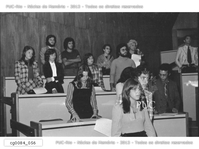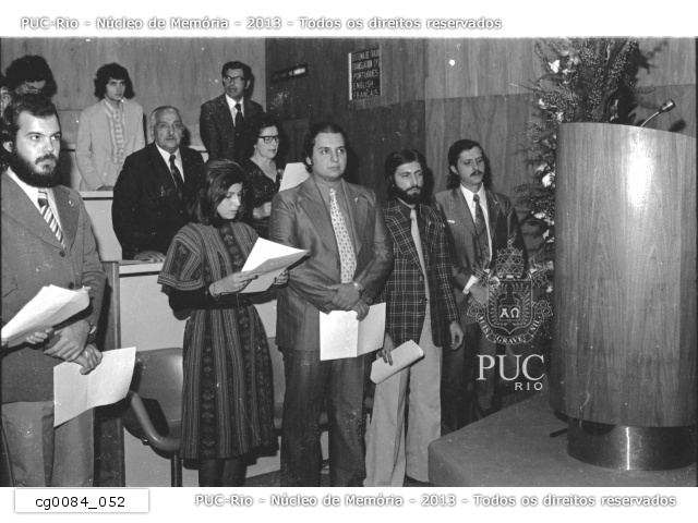 Cerimônia de formatura do curso de Processamento de Dados da PUC-Rio, primeira turma do antigo P-15. Professores sentados e formandos em pé. |