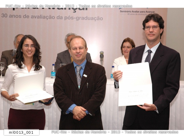 ml0013_001 | 9/11/2006 | Danielle Carusi Machado, ex-aluna do programa de pós-graduação do Departamento de Economia, recebe o Prêmio Capes de Teses, em Brasília, com o trabalho intitulado Escolaridade das crianças no Brasil: três ensaios para a defasagem idade-série. Ao centro, o Diretor de Avaliação da Capes, prof. Renato Janine Ribeiro, e ao lado o orientador da tese, prof. Gustavo Gonzaga (ECO). |