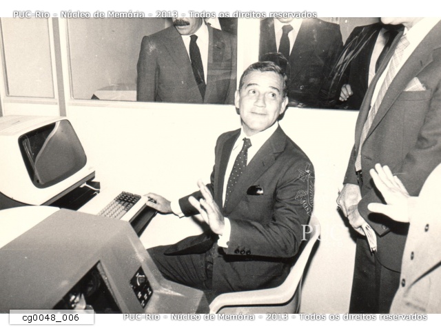 cg0048_005 | 2/10/1981 | Autoridades da PUC-Rio e convidados na inauguração da sala dos terminais para contagem de créditos, sistema desenvolvido pelo Laboratório de Otimização de Sistemas (LOS). |