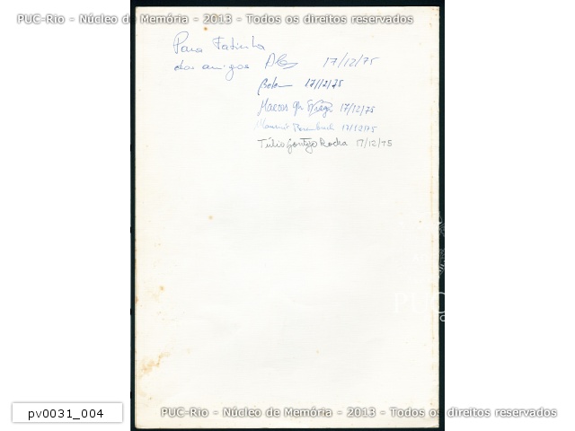 pv0031_004 | 12/1975 | Alguns formandos da turma de Engenharia Elétrica de dezembro de 1975 assinaram a contracapa do convite de formatura para a funcionária Maria de Fátima de Castro Dinoá, secretária do Departamento de Engenharia Civil. |