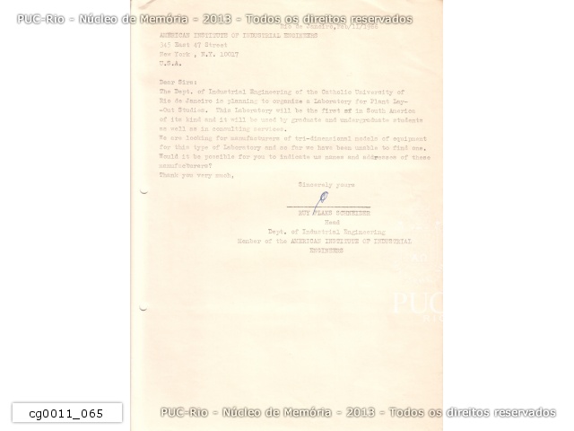 Correspondência do prof. Ruy Schneider (IND) para American Institute of Industrial Engineers |