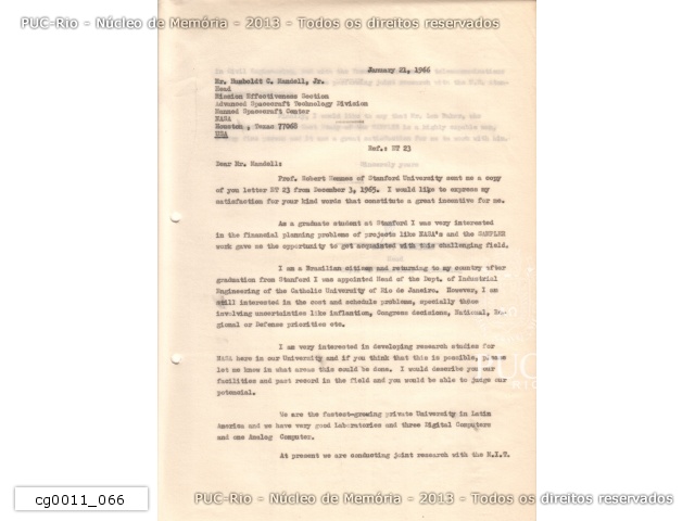 Correspondência do prof. Ruy Schneider (IND) para Humbldt Mandell Jr. (NASA). |