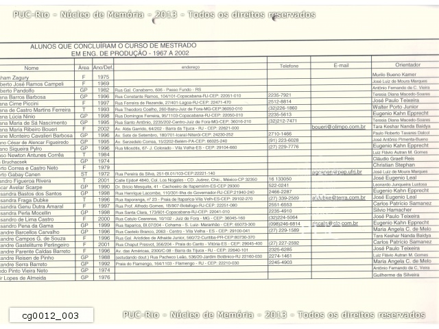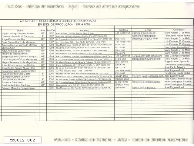 Lista de alunos que concluíram o mestrado em Engenharia de Produção, oferecido pelo Departamento de Engenharia Industrial (IND), entre 1997 e 2002. |