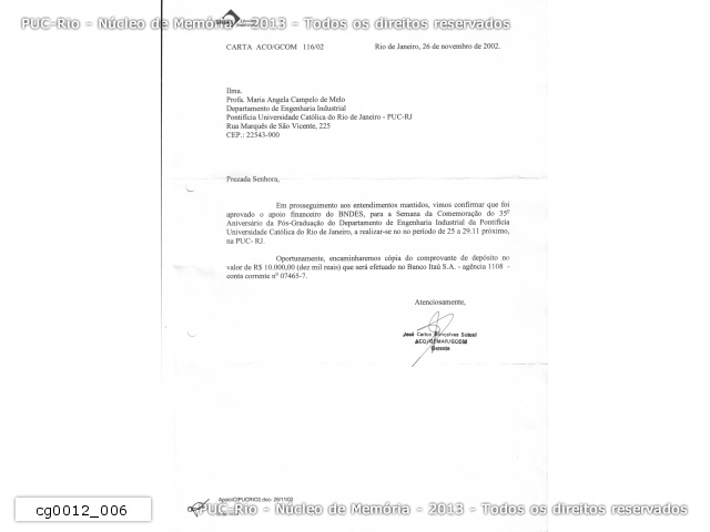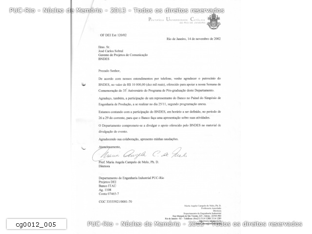 Carta de agradecimento a José Carlos Sobral, Gerente de Projetos de Comunicação do BNDES, pelo patrocínio à Semana de Comemoração dos 35 anos do programa de pós-graduação em Engenharia de Produção. |