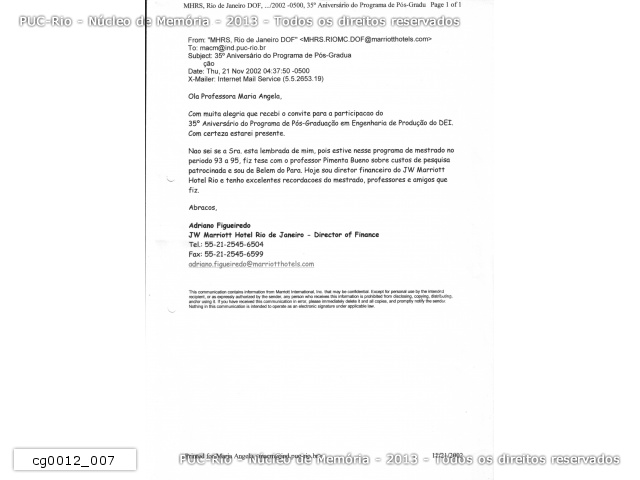 Carta de Adriano Figueiredo (Marriott Hotel Rio de Janeiro) a prof. Maria Angela Campelo de Melo (IND), confirmando sua participação na Semana de Comemoração dos 35 anos do programa de pós-graduação em Engenharia de Produção. |