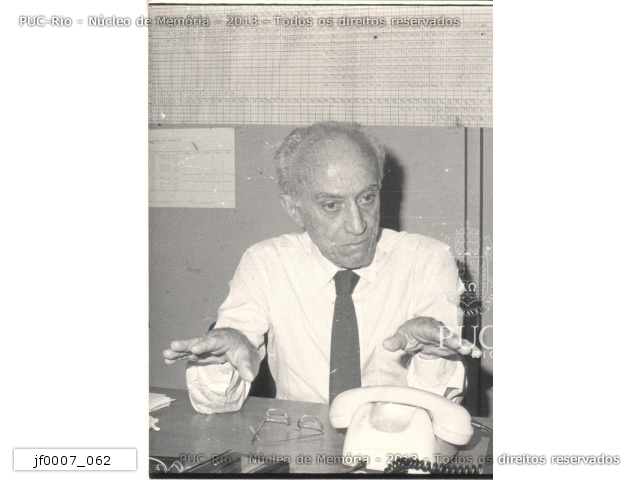 O cientista Albert Sabin concede entrevista para a Assessoria de Imprensa da Vice-reitoria de Desenvolvimento da PUC-Rio. Na ocasião, Sabin era aluno do curso de Português para Estrangeiros da Universidade. |