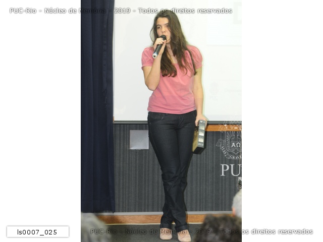 A aluna Ágatha Lopes Tommasi Oliveira (Instituto Gay Lussac) discursa após receber a menção honrosa na categoria do texto do concurso promovido pelo Seminário Machado de Assis (1908 - 2008). |