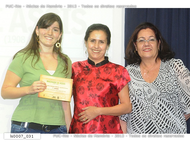 Premiação da aluna Bruna Regis Iannelli, do Colégio Pedro II, primeira colocada na categoria audiovisual do concurso promovido pelo Seminário Machado de Assis (1908 - 2008). |