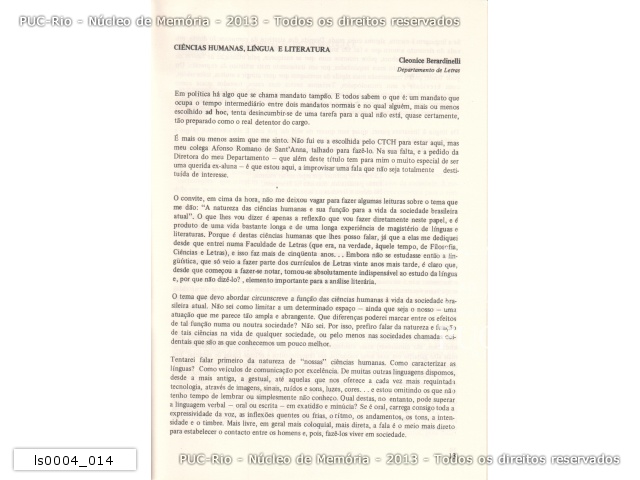 ls0004_014 | 11/1988 | Texto com a fala da professora Cleonice Berardinelli do Departamento de Letras, substituindo o professor Afonso Romano de Sant'Anna que não pôde comparecer. |