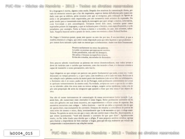 ls0004_015 | 11/1988 | Continuação da fala da professora Cleonice Berardinelli (LET), substituindo o professor Afonso Romano de Sant'Anna que não pode comparecer. |