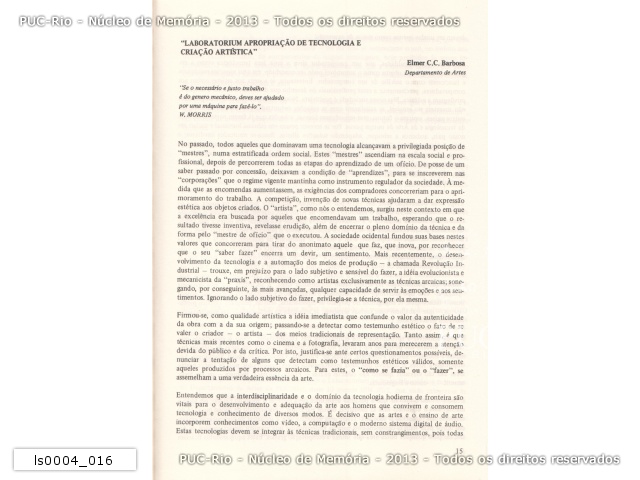 ls0004_016 | 11/1988 | Texto do professor Elmer C. C. Barbosa (Departamento de Artes) traçando uma narrativa histórica do surgimento do artista. |
