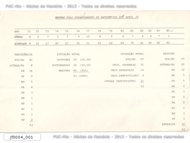 | Tabelas com dados estatísticos do Departamento de Matemática da PUC-Rio até 1985 - jf0004_002 |
