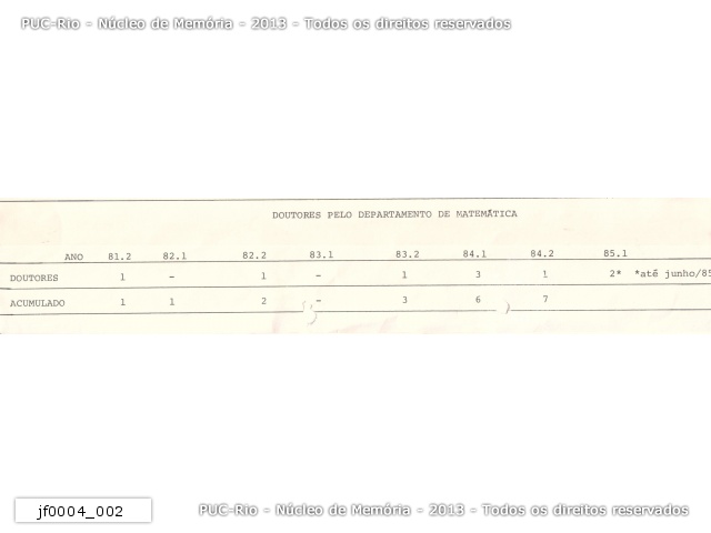 jf0004_002 | 1985 | Número de doutores formados pelo Departamento de Matemática da PUC-Rio a cada período letivo, entre 1981 e 1985 |
