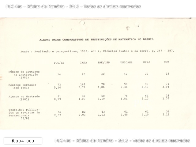 | Tabelas com dados estatísticos do Departamento de Matemática da PUC-Rio até 1985 - jf0004_003 |