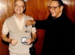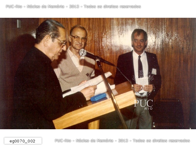 O Reitor Pe. Laércio S.J. entrega ou recebe um prêmio ou medalha. |