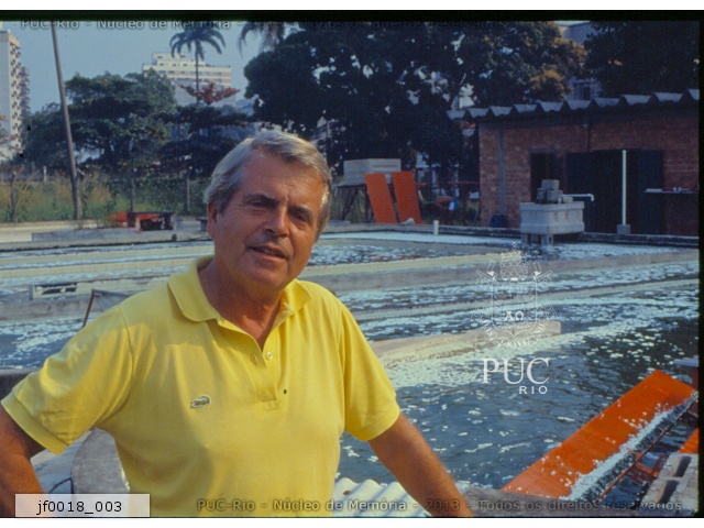 jf0018_002 | 1986 circa | Fotografia do Professor Klaus Paul Wagener, professor-visitante do Departamento de Química. Área cercada onde estavam instalados tanques para a pesquisa Maricultura em Terra. |