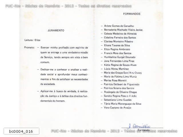 bc0004_016 | 29/12/1981 | Convite de formatura, p.7 e 8. Juramento e lista de formandos. |