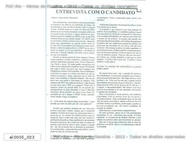 Página 07, ano 1, num. 1, Julho/1998. "Entrevista com o candidato", Luiz Carlos Machado, na época do PSDB. Sobre sua atuação nos sindicatos e sobre a representatividade do movimento estudantil. |