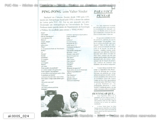 Página 08, ano 1, num. 1, Julho/1998. "PING-PONG com Valter Sinder", entrevista com o professor do Departamento de Sociologia. Foto de Valter Sinder durante a entrevista. Coluna "Para Você Pensar", com pequenos tópicos. Coluna "Ouvi Falar Que...", com notas sobre cultura. Assinado por Claudia M. Abreu Campos. |