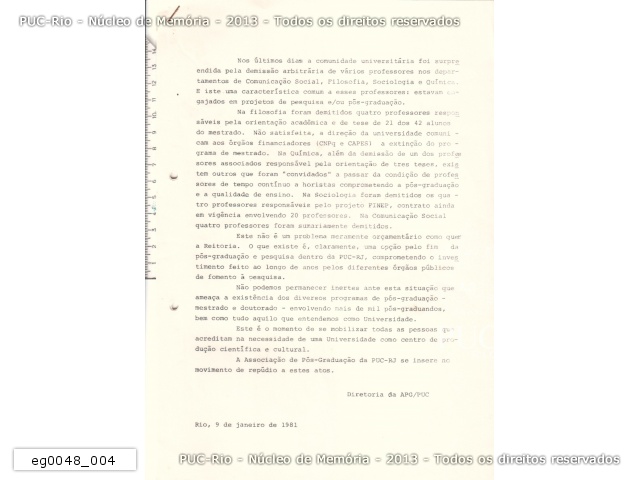 | Série de cartas da APG para a comunidade acadêmica da PUC-Rio sobre a demissão de professores da Pós-Graduação. - eg0048_004 |