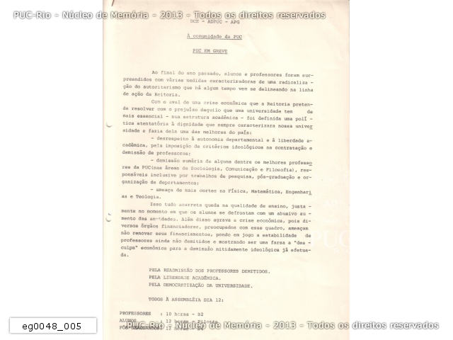 | Série de cartas da APG para a comunidade acadêmica da PUC-Rio sobre a demissão de professores da Pós-Graduação. - eg0048_005 |