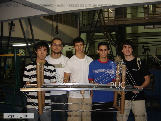 cg0155_001 | 22/6/2007 | Alunos do prof. Ghavami, do Departamento de Engenharia Civil, em laboratório do ITUC, com maquete/projeto de ponte. |