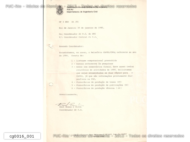 Correspondência do Coordenador de Pós-Graduação do Departamento de Engenharia Civil, prof. Raul Rosas e Silva (CIV), para o Coordenador Central de Pós-Graduação, anunciando o envio em anexo do Relatório CAPES/CNPq do ano de 1984. |