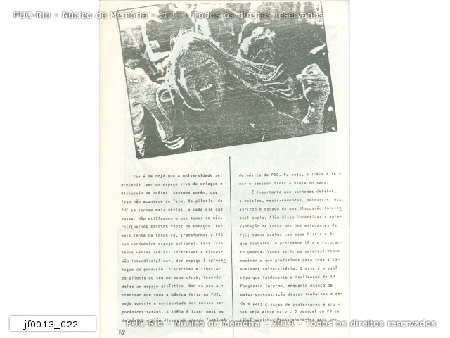 Página 10. Publicação do DCE da PUC-Rio. Proposta de transformação do campus da PUC-Rio em espaço cultural. IV Congresso Interno. Proposta de maior integração entre a pós-graduação e a vida universitária e de maior troca de experiências entre os diversos cursos da PUC-Rio. |