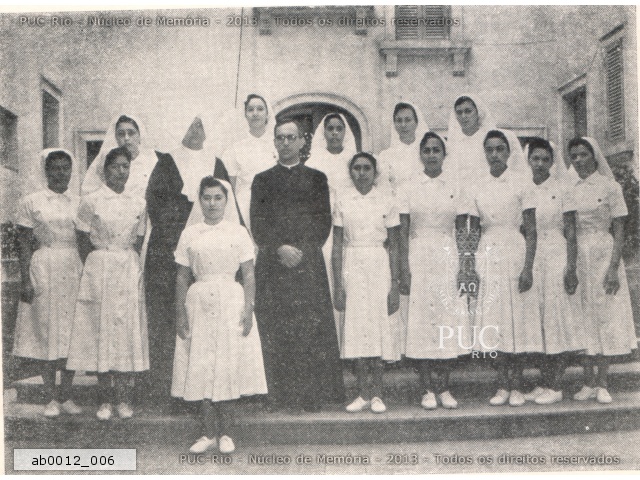 Alunas representantes da Escola de Enfermagem com o reitor pe. Pedro Velloso S.J., por ocasião da Páscoa. |