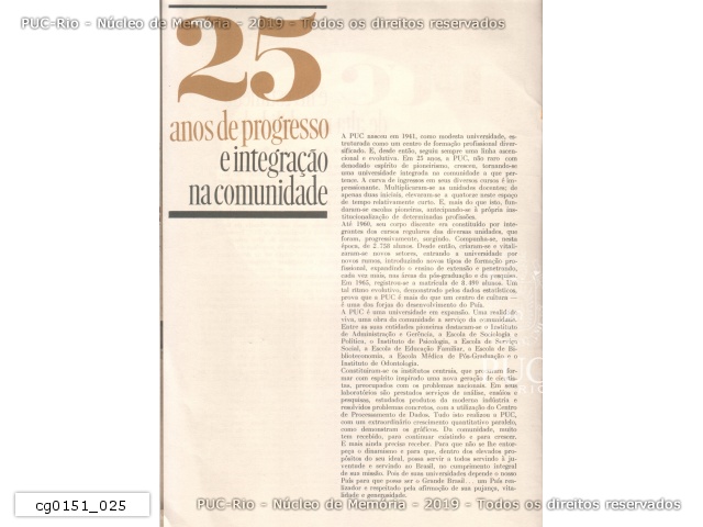 cg0151_025 | 1966 | Página do folder de divulgação da Campanha Financeira "Seja mais uma coluna da PUC". "25 anos de progresso e integração na comunidade". Breve histórico da PUC-Rio. Quantidades de alunos e expansão dos cursos nos últimos anos. |