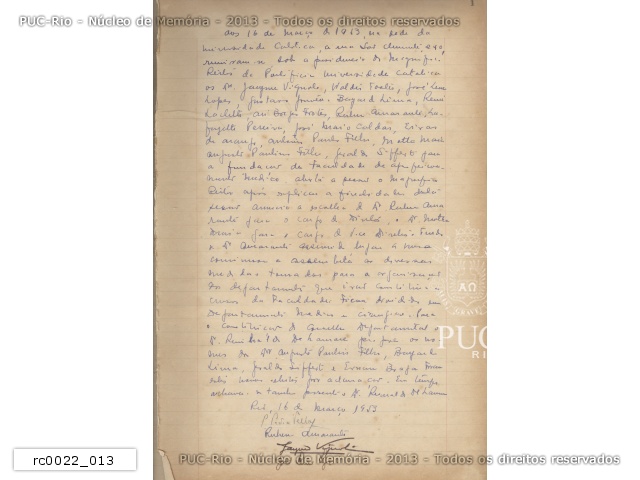 rc0022_013 | 16/3/1953 | Ata de fundação da Faculdade de Aperfeiçoamento Médico (Escola Médica de Pós-Graduação). Assinaturas do reitor Pe. Velloso S.J., do prof. Rubem Amarante, do prof. Jayme Vignolo [?] e do pe. José Leme Lopes S.J.. |