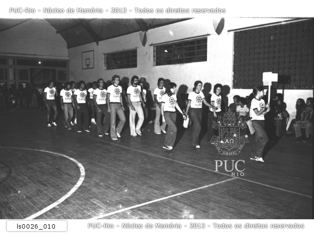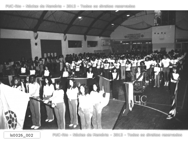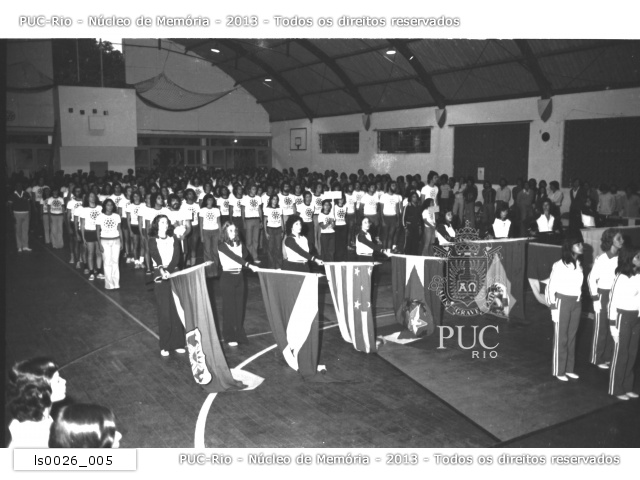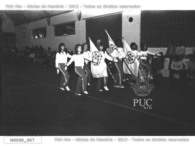 ls0026_010 | 23/10/1975 | Cerimônia de abertura da I Olimpíada Interna da ENGEPUC. Participaram alunos, funcionários e professores. Camisetas e bandeiras da caderneta de poupança Grande Rio. |