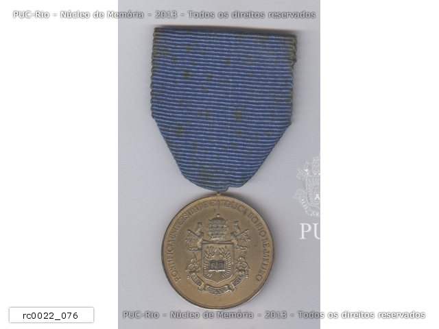 rc0022_076 | 1950 circa | Medalha com o brasão da PUC-Rio, sem data, com um padrão de brasão intermediário. Verso de medalha do Prêmio Prof. Lacerda de Almeida. Talvez refira-se a "Francisco de Paula Lacerda de Almeida", jurista e professor, ligado a Centro Dom Vital, falecido em 1943. |