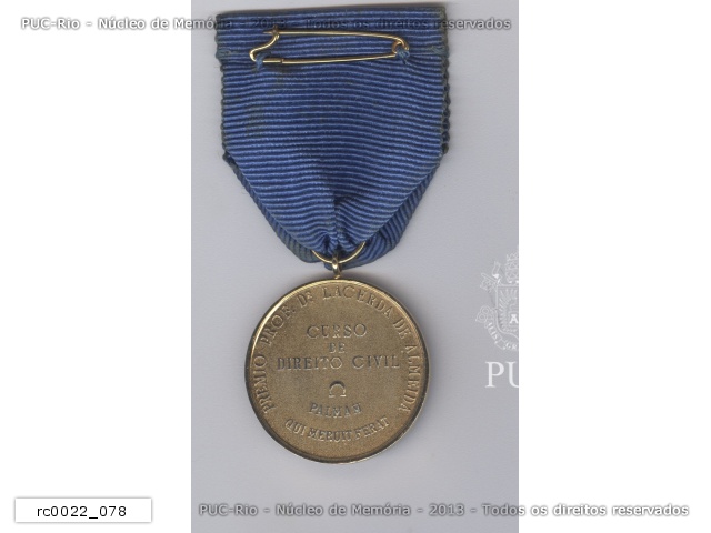 rc0022_078 | 1950 circa | Verso de medalha do Prêmio Prof. Lacerda de Almeida. Talvez refira-se a "Francisco de Paula Lacerda de Almeida", jurista e professor, ligado a Centro Dom Vital, falecido em 1943. Na outra face, brasão da PUC-Rio, sem data, com um padrão de brasão intermediário. |
