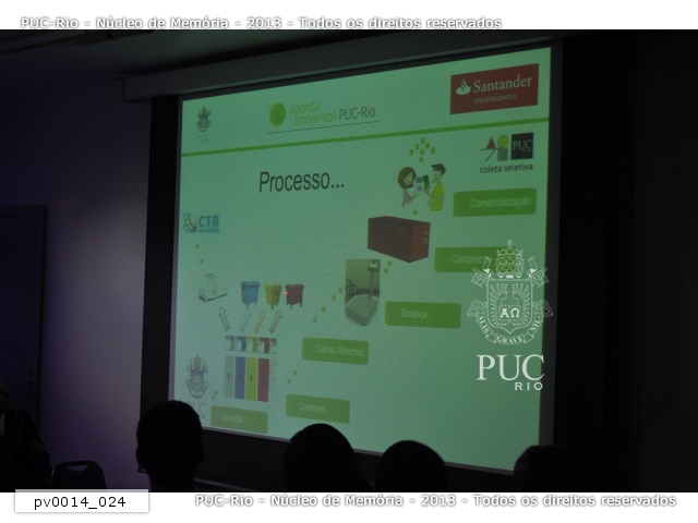 Apresentação da Agenda Ambiental PUC-Rio e Santander Universidades, realizada pelo prof. Luiz Felipe Guanaes Rego, diretor do NIMA. Exposição do sistema de coleta seletiva a ser implantado no campus da universidade. |