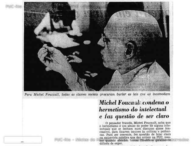 Ciclo de Conferências de Michel Foucault que ministrou, a convite do Departamento de Letras e Artes e da Coordenação dos Cursos de Extensão, um curso sobre “A verdade e as formas jurídicas – a investigação, a prova e o exame".