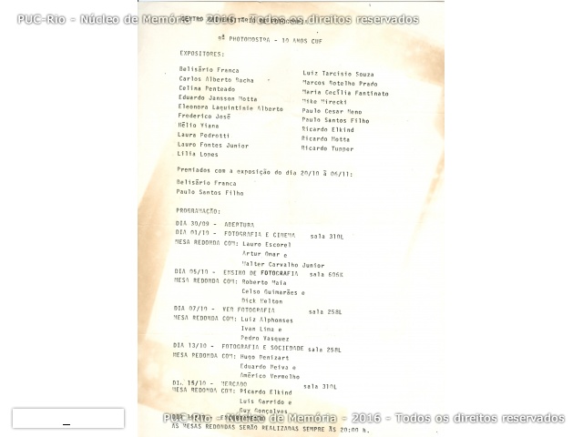 Comemoração dos 10 anos do CUF (Centro Universitário de Fotografia), com apoio da Funarte. Exposição nos pilotis, e palestras: Fotografia e Cinema, com Lauro Escorel, Artur Omar e Walter Carvalho Filho; Ensino de Fotografia, com Celso Guimarães, Dick Welton e Roberto Maia; Ver Fotografia, com Ivan Lima, Luiz Alphonsus e Pedro Vasquez; Fotografia e Sociedade, com Américo Vermelho, Eduardo Neiva e Hugo Denizart; Mercado, com Guy Gonçalves, Luiz Garrido e Ricardo Elkind.