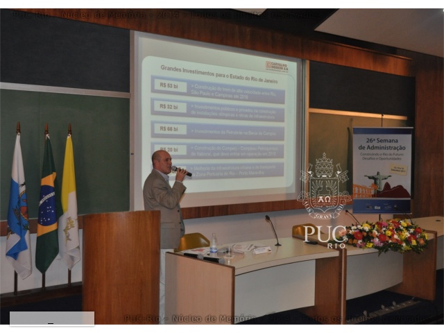 A 26ª Semana de Administração teve como tema Construindo o Rio do futuro: desafios e oportunidades. Organizado pelo Instituto de Administração e Gerência (IAG), contou com a participação de representantes do Comitê Organizador dos Jogos Olímpicos e Paraolímpicos Rio 2016, da Empresa Olímpica Municipal, das empresas Rio Negócios, H. Stern e Carvalho Hosken e da Associação Brasileira da Indústria de Hotéis do Estado do Rio de Janeiro (ABIH-RJ). O evento realizou-se no Auditório do RDC.