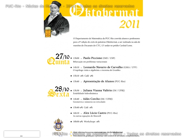 O IX Oktobermat, realizado no Decanato do CTC, apresentou um ciclo de palestras dirigidas a alunos de Graduação e Pós-Graduação em Matemática e áreas afins apresentadas por professores do Departamento de Matemática da PUC-Rio, do Instituto de Matemática da UFRJ, do Departamento de Matemática Aplicada da UFF e do Instituto de Matemática e Estatística da USP.