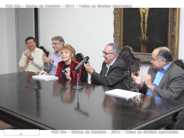 A homenagem à Profa. Sonia de Camargo ocorreu na sala do Conselho Universitário e contou com a presença do Reitor Prof. Pe. Josafá Carlos de Siqueira S.J., do Decano do CCS Prof. Luiz Roberto Azevedo Cunha e dos Vice-Reitores da PUC-Rio, além de professores, alunos e funcionários.