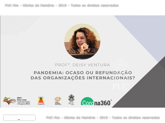 Com Deisy Ventura, professora de Ética da Faculdade de Saúde Pública da Universidade de São Paulo. Seguindo as orientações de distanciamento social, a aula inaugural virtual do MAPI tratou do papel das Organizações Internacionais (OIs) na gestão de crises internacionais, como a pandemia COVID-19, e dos efeitos dessas crises sobre as próprias OIs.