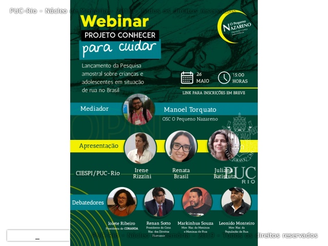 Lançamento da pesquisa amostral sobre crianças e adolescentes em situação de rua no Brasil, do Centro Internacional de Estudos e Pesquisas sobre a Infância (CIESPI) associado à PUC-Rio. Com a Profa. Irene Rizzini (SER), Juliana Batistuta, Renata Mena Brasil do Couto, Iolete Ribeiro da Silva (CONANDA), Renan Sotto Mayor (Conselho Nacional dos Direitos Humanos), Markinhus Souza (Movimento Nacional de Meninos e Meninas de Rua) e Leonildo Monteiro (Movimento Nacional da População de Rua).