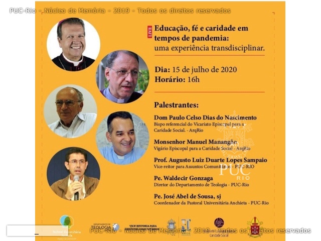 Foram palestrantes Dom Paulo Celso Dias do Nascimento e Monsenhor Manuel Manangão, da Arquidiocese do Rio de Janeiro; Prof. Augusto Sampaio, Vice-Reitor Comunitário; Pe. Waldecir Gonzaga (TEO) e Pe. José Abel de Souza S.J., da Pastoral Universtária Anchieta.
