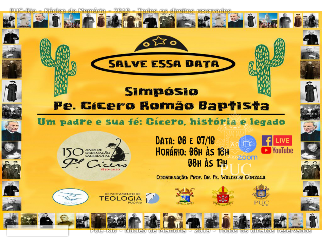 Um padre e sua fé: Cícero, história e legado. Em comemoração dos 150 anos da ordenação de Padre Cícero, o Departamento de Teologia, a Arquidiocese de São Sebastião do Rio de Janeiro e a Diocese de Crato, no Ceará, realizaram o simpósio. Mesa de Abertura com o Cardeal Dom Orani Tempesta, O.Cist., Arcebispo do Rio de Janeiro; Dom Gilberto Pastana de Oliveira, da Diocese de Crato; Pe. Josafá Carlos de Siqueira S.J., Reitor da PUC-Rio, Pe. Cícero José da Silva, Reitor da Basílica Santuário Nossa Senhora das Dores, e o Prof. Pe. Waldecir Gonzaga (TEO). Evento realizado através da plataforma Zoom.