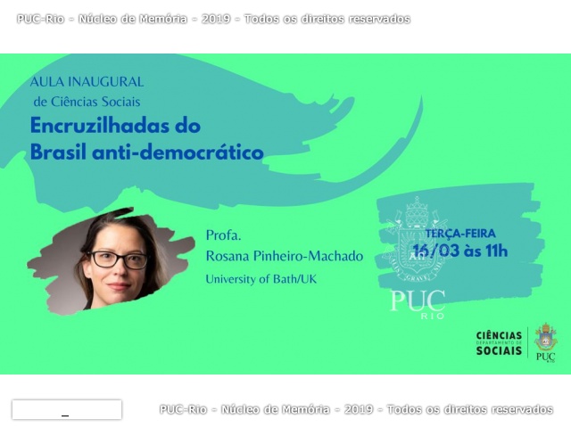 Tema: Encruzilhadas do Brasil antidemocrático. Palestrante: profa. Rosana Pinheiro (Social Sciences and Policy, University of Bath, Reino Unido).