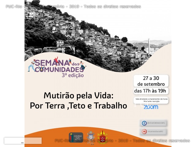 Com o tema Mutirão pela Vida: Por Terra, Teto e Trabalho. Os encontros, promovidos pelo convênio entre a Vice-Reitoria Comunitária e a Arquidiocese de São Sebastião do Rio de Janeiro. A abertura teve a mediação da assistente social Andréa Paiva (VRC), com a participação do Vice-Reitor Comunitário, prof. Augusto Sampaio; do diretor do Departamento de Teologia, padre Waldecir Gonzaga; do Vice-Reitor Geral, Pe. Anderson Antonio Pedroso S.J., e do Vigário Episcopal para Caridade Social, monsenhor Manuel Manangão.