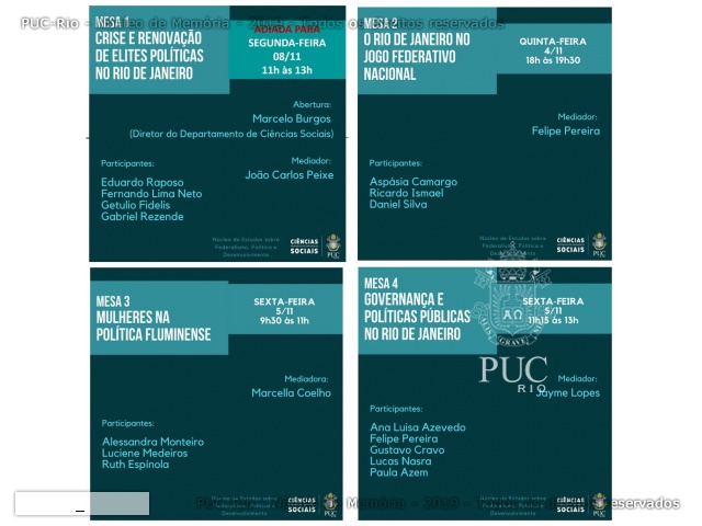 Seminário organizado pelo Núcleo de Estudos sobre Federalismo, Política e Desenvolvimento, do Departamento de Ciências Sociais. O diretor do Departamento, professor Marcelo Burgos, proferiu a palestra de abertura do encontro com o tema Crise e renovação de elites políticas no Rio de Janeiro.