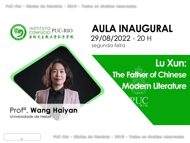 Lu Xun: The Father of Chinese Modern Literature. Palestrante: profa. Wang Haiyan, Doutora em Literatura Chinesa Moderna e Contemporânea, professora Associada na Universidade de Hebei (China) e Diretora do Instituto Confucius da Universidade da Malásia.