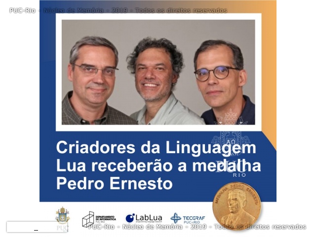Criada em 1993 pelos professores Roberto Ierusalimschy e Waldemar Celes, do Departamento de Informática, e Luiz Henrique de Figueiredo, do Instituto de Matemática Pura e Aplicada, a linguagem de programação Lua é destaque no cenário mundial, sendo amplamente utilizada na indústria de jogos e sistemas embarcados. A medalha Pedro Ernesto é a mais alta comenda do município do Rio de Janeiro.