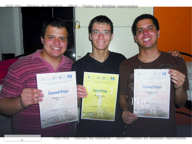 Três Alunos da PUC-Rio foram premiados na International Mathematics Competition for University Students. O evento ocorreu em Blagoevgrad, na Bulgária. Os três Alunos brasileiros melhor colocados no evento foram da PUC-Rio, do Departamento de Matemática: Hugo Fonseca (20 anos, medalha de prata e 49º lugar geral), Matheus Secco (18 anos, medalha de prata e 77º lugar geral) e Renan Finder (19 anos, medalha de ouro e 13º lugar geral). A PUC-Rio ficou em 9º lugar entre as 77 universidades, e em 1º lugar entre as 6 brasileiras.